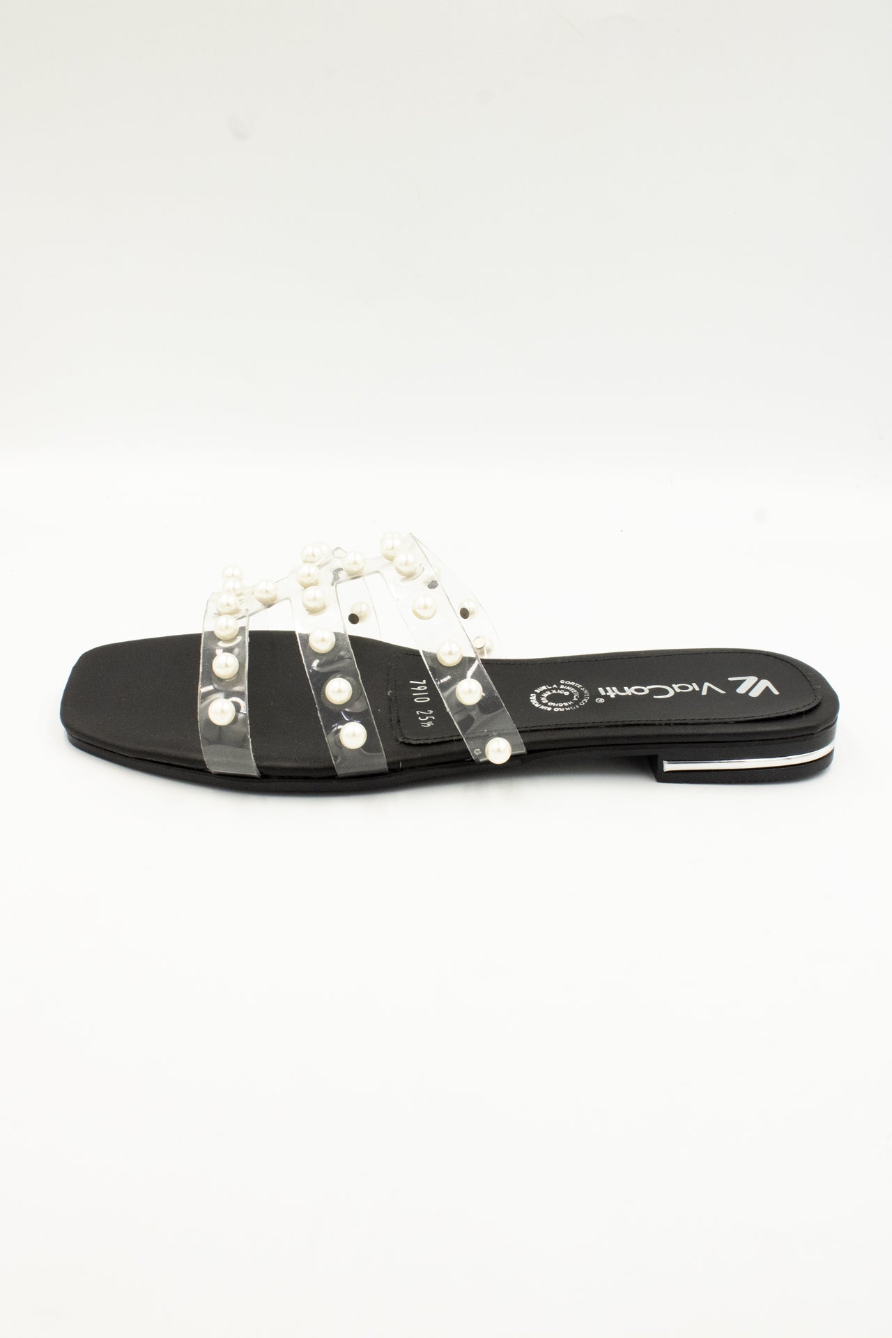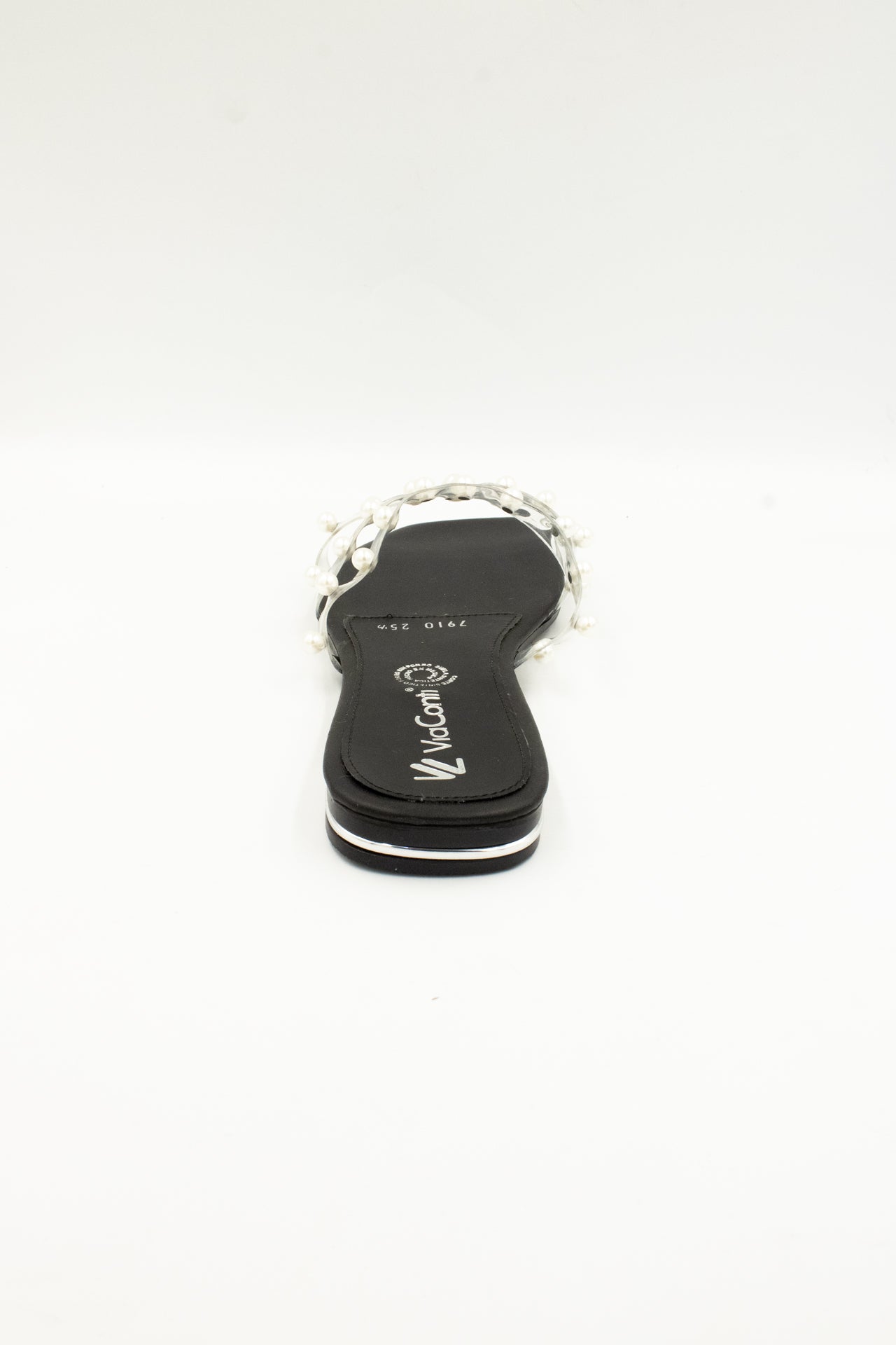 Sandalia de piso, detalle de oro en la suela, perlas en la chinela transparente y superficie en sintético Napa negro Calzado 100% Mexicano.