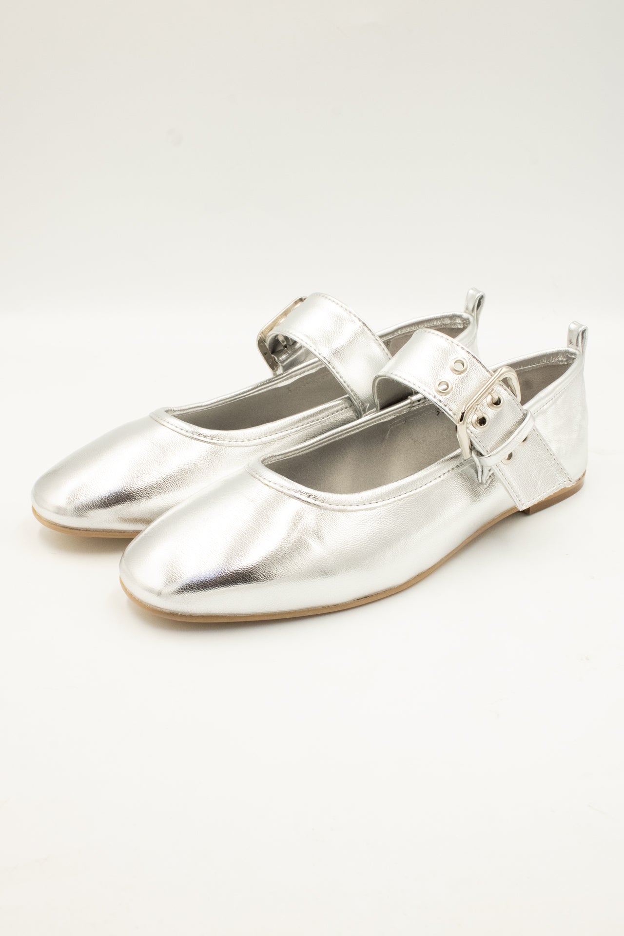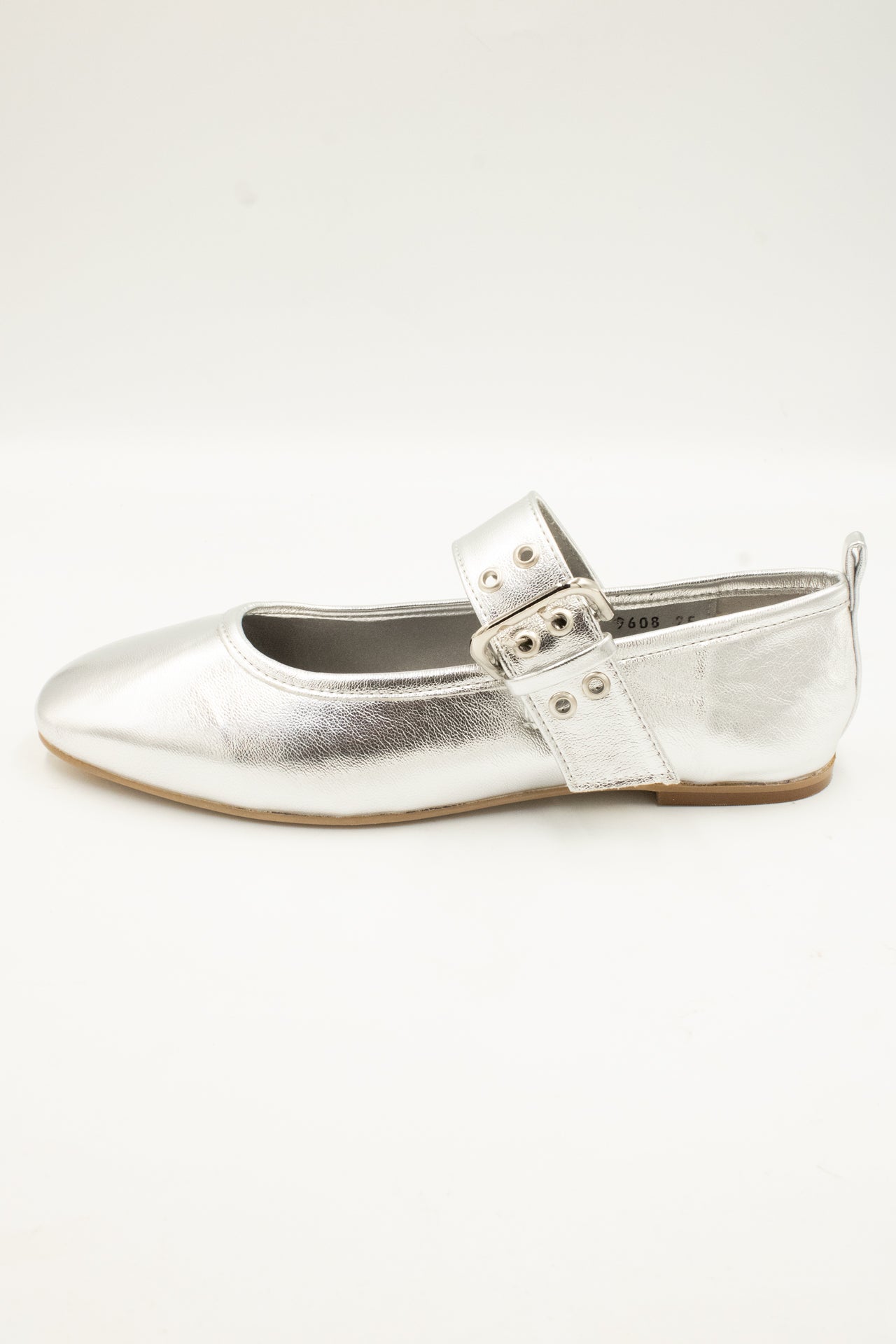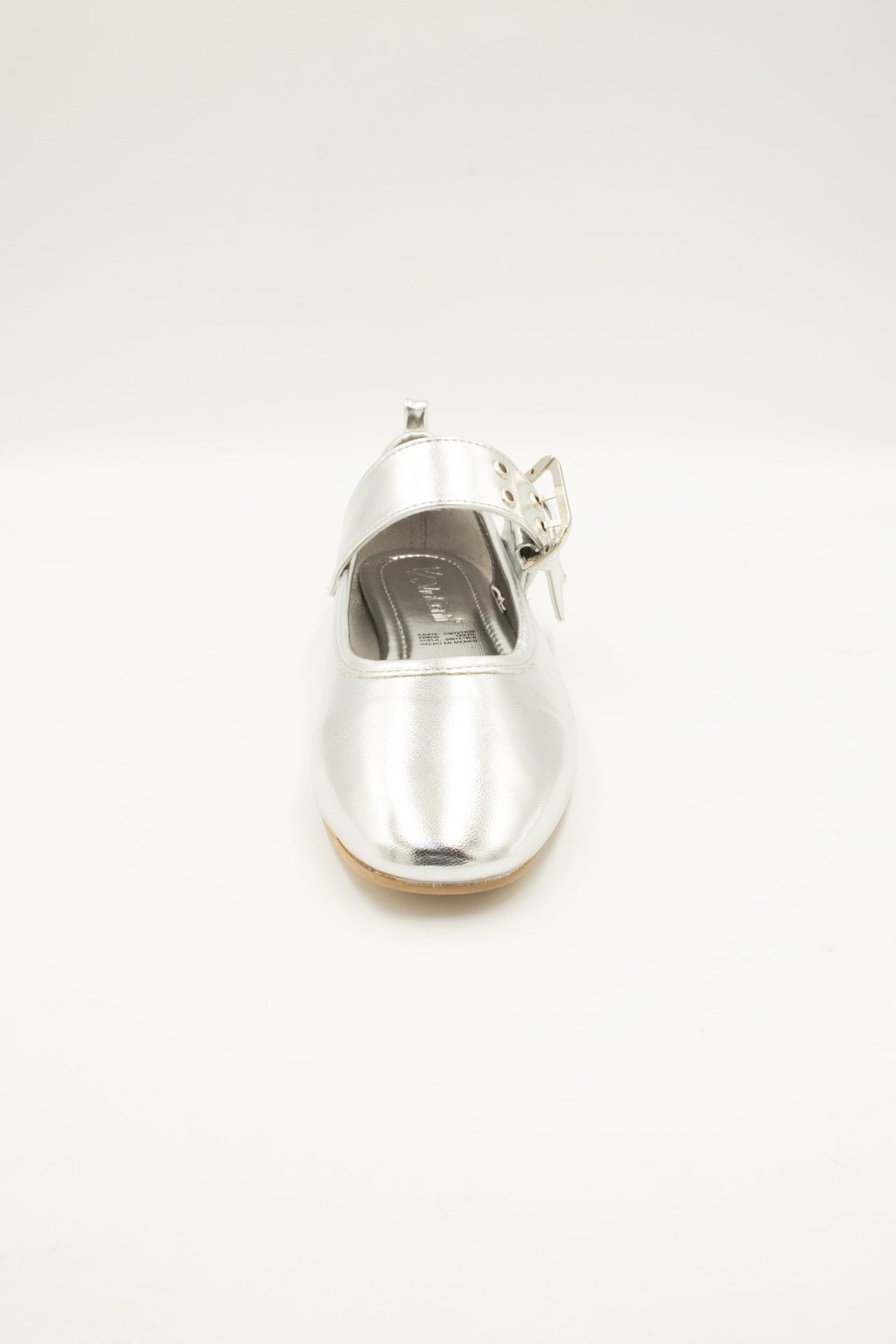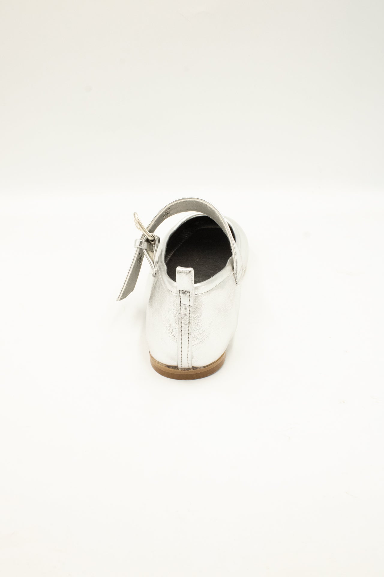 Zapatilla de piso con látigo y hebillas para ajuste. Superficie en Napa plata, sintético.