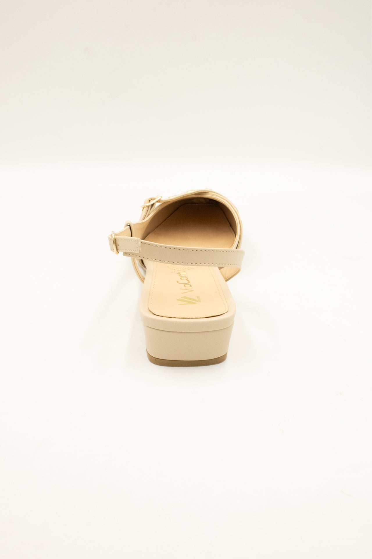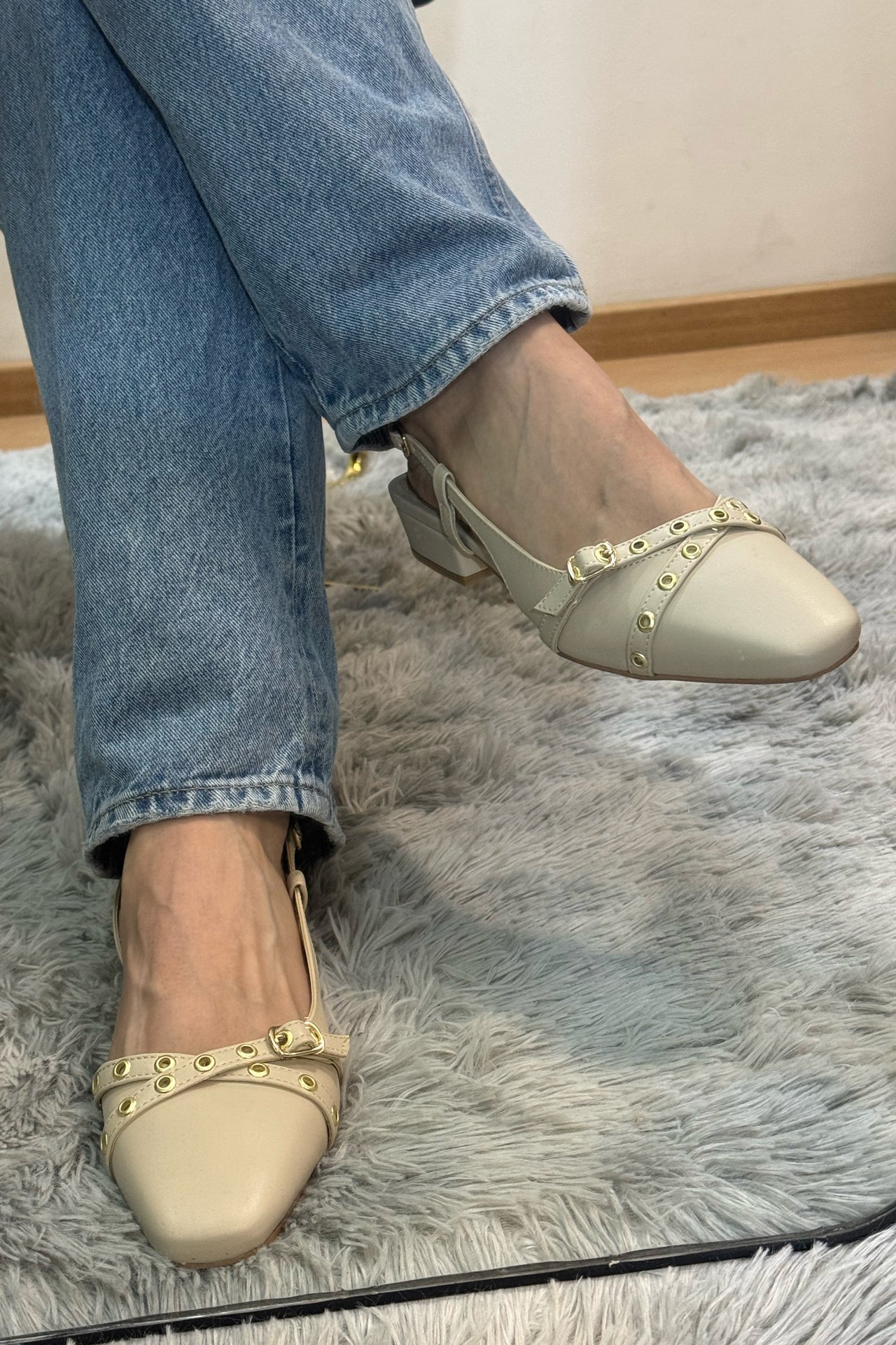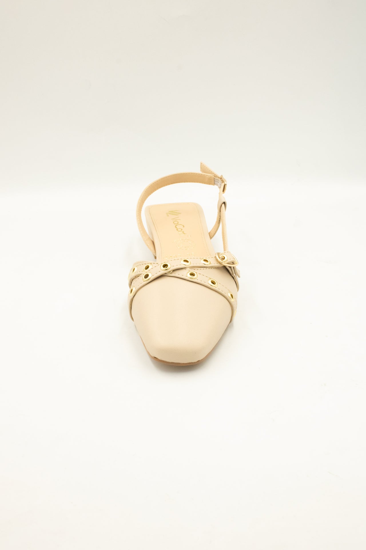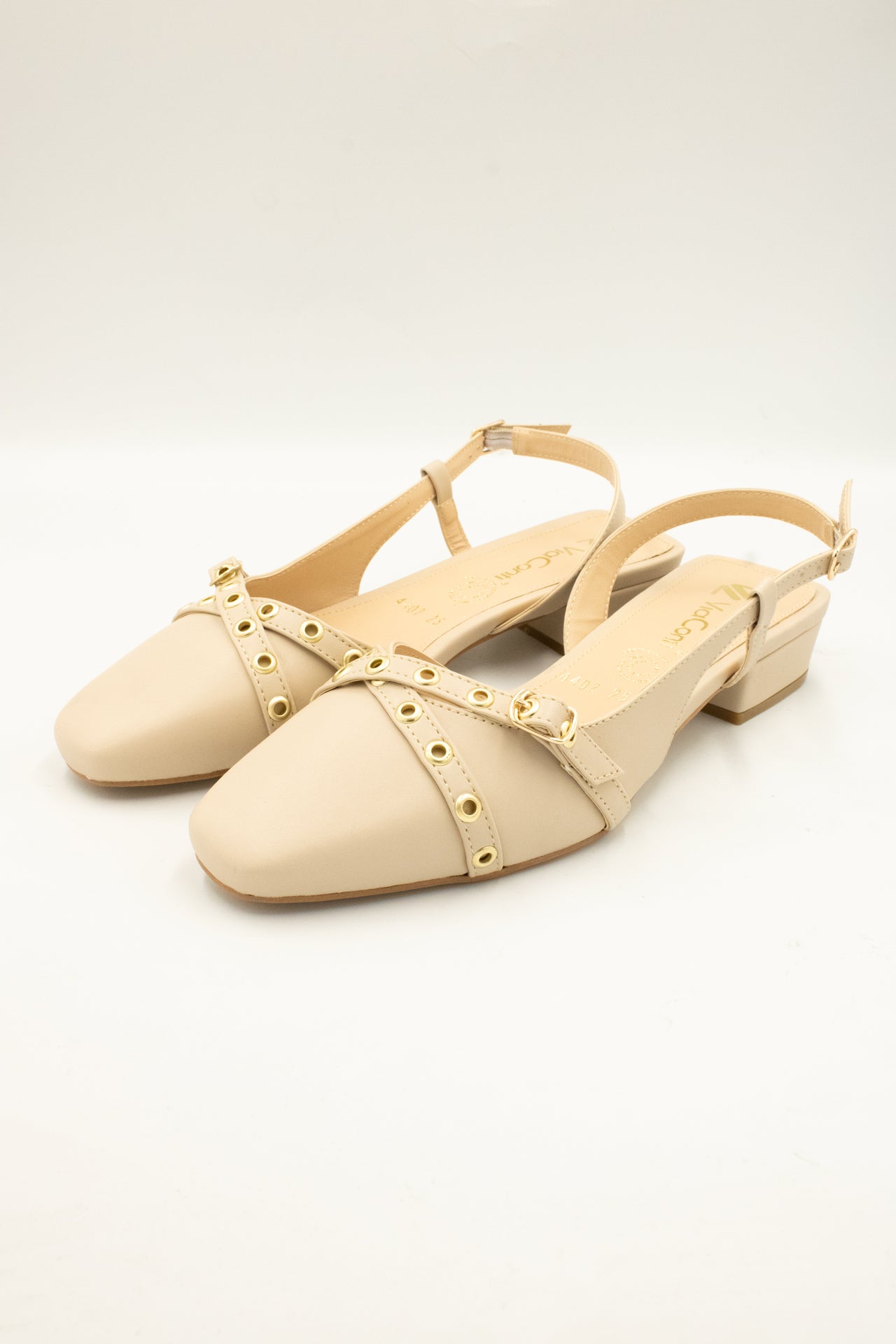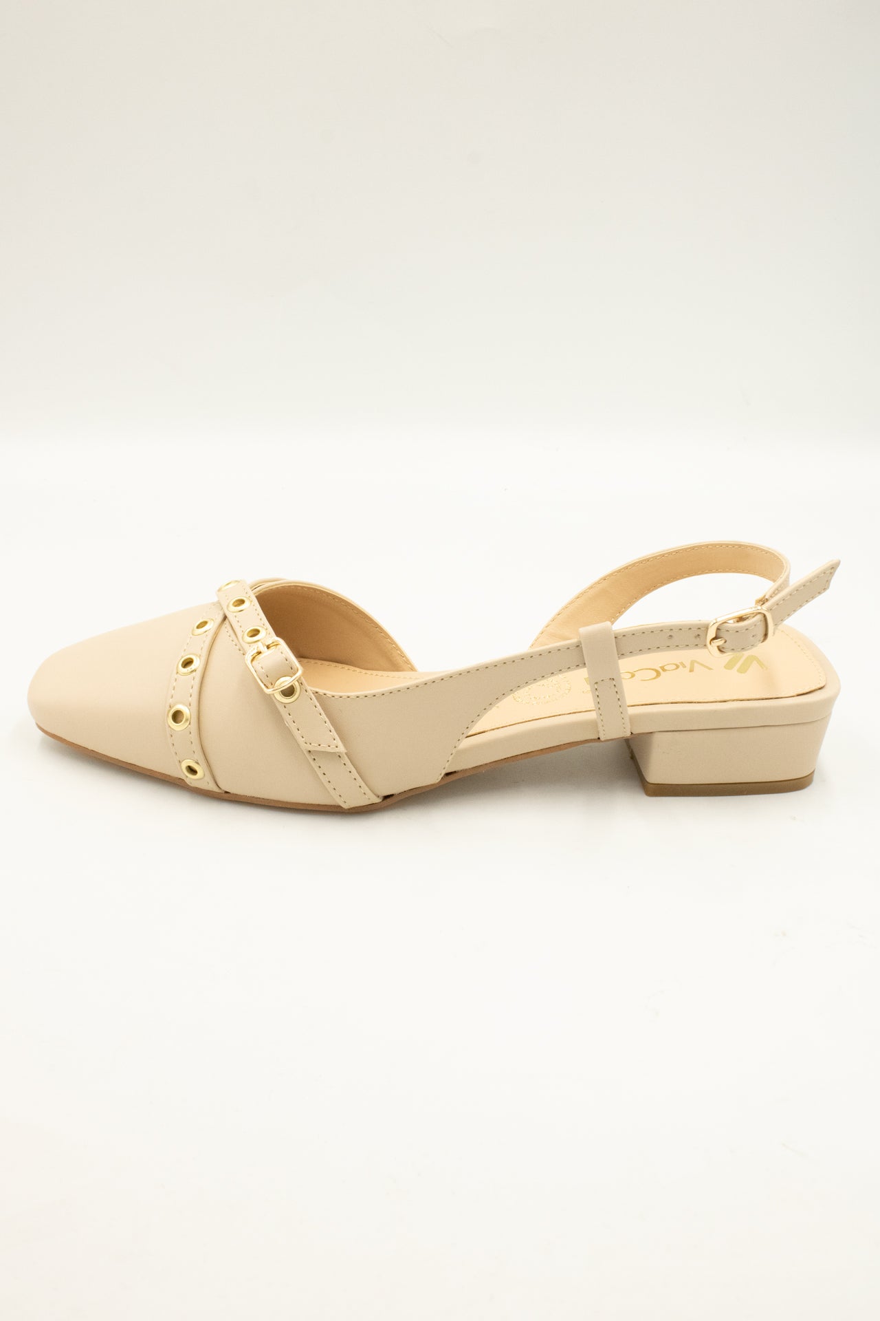 Zapatilla de tacón, con hebilla ajustable y ojillos. Superficie en nude, sintético.
