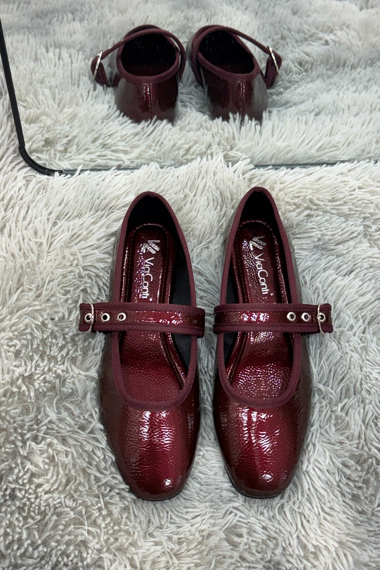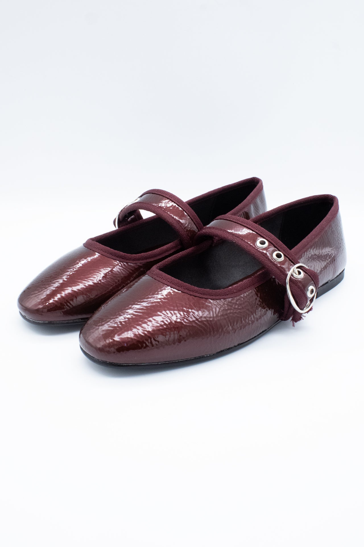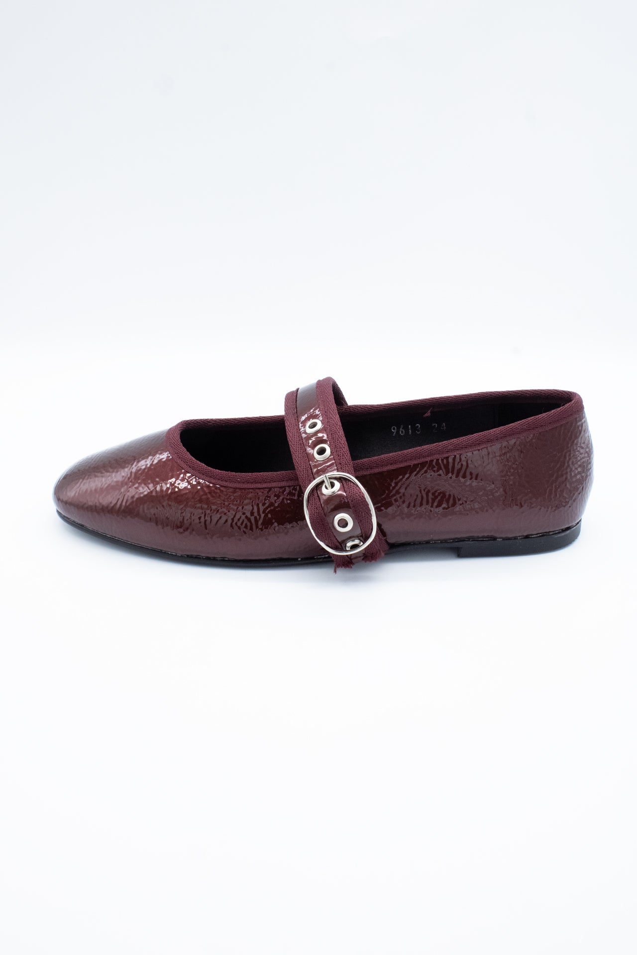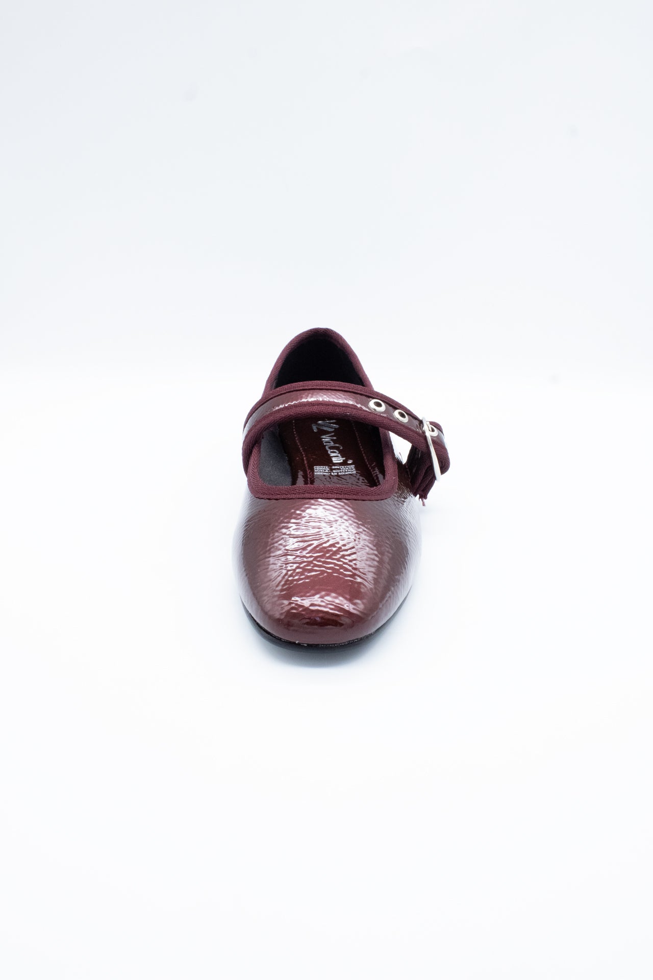 Balerina de piso con ribete, ojillos y hebillas para ajuste. Superficie en charol vino sintético.