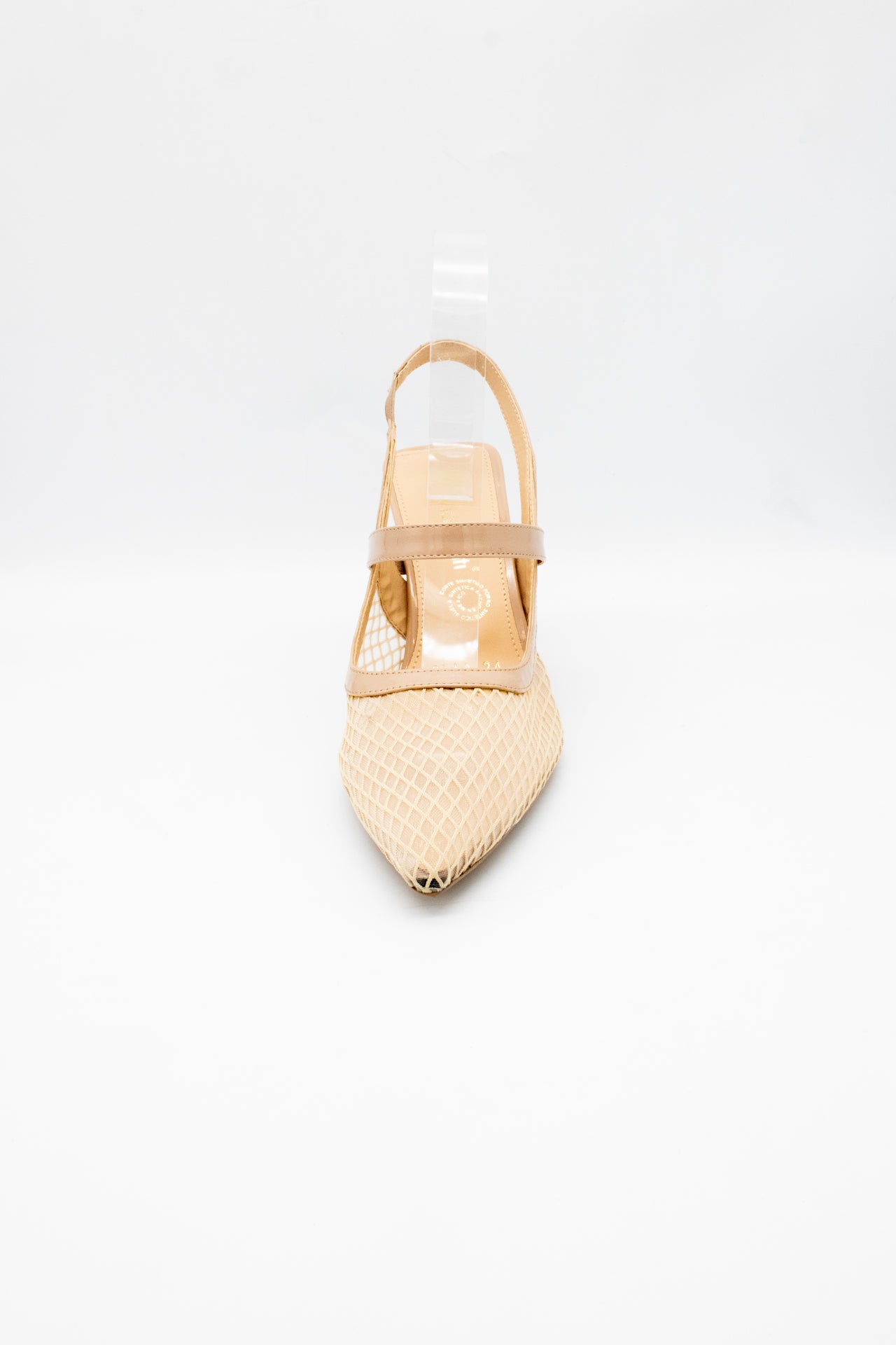 Zapatilla de tacón con punta picuda. Superficie en sintetico beige y hebillas