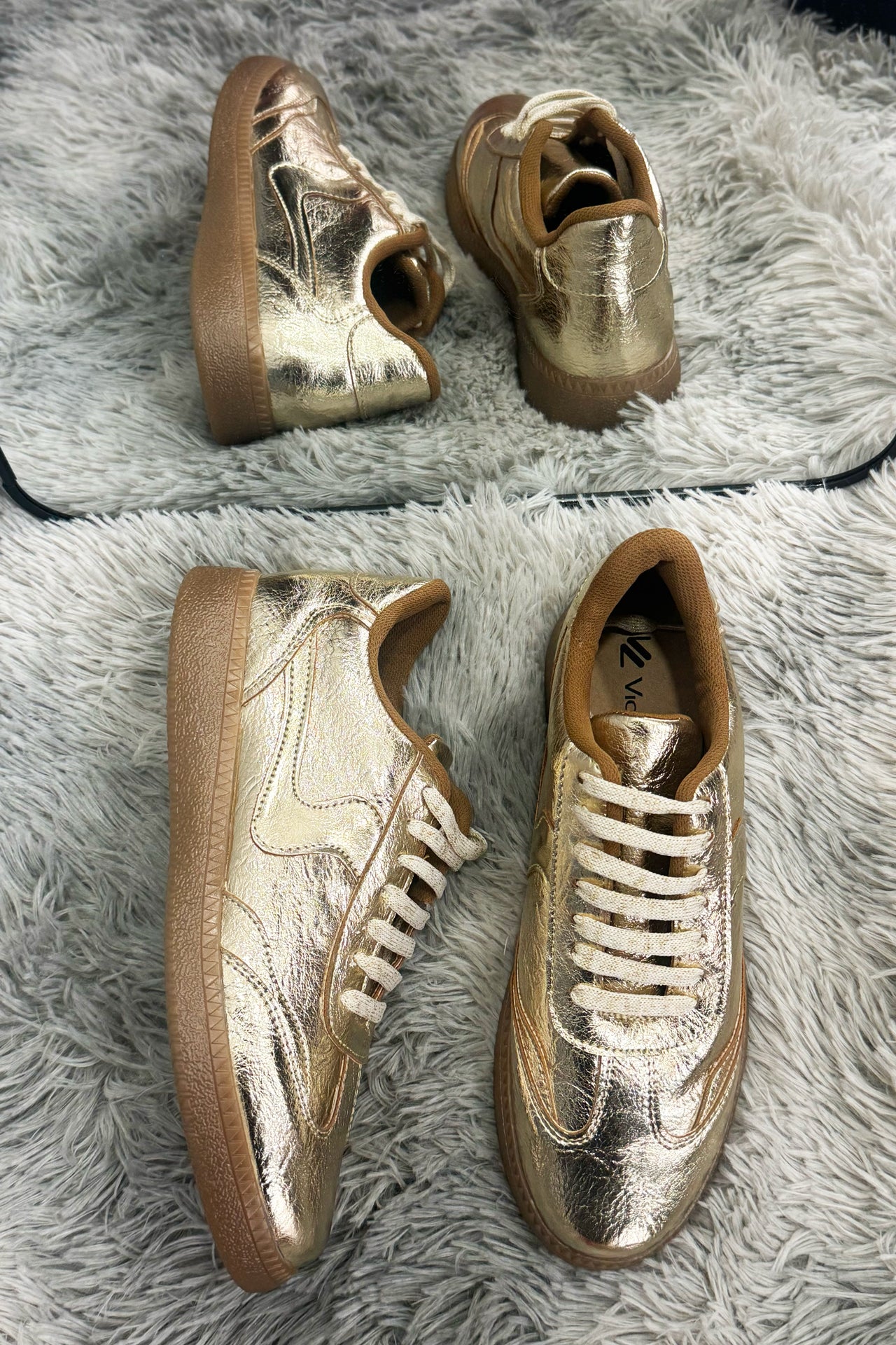 Tenis con suela de goma. Superficie en acabado metálico oro, sintético.