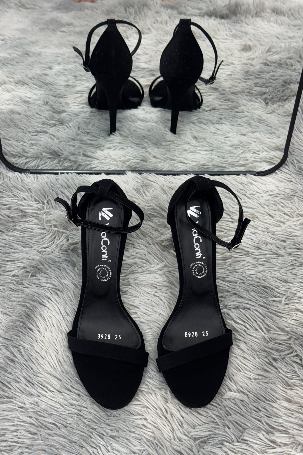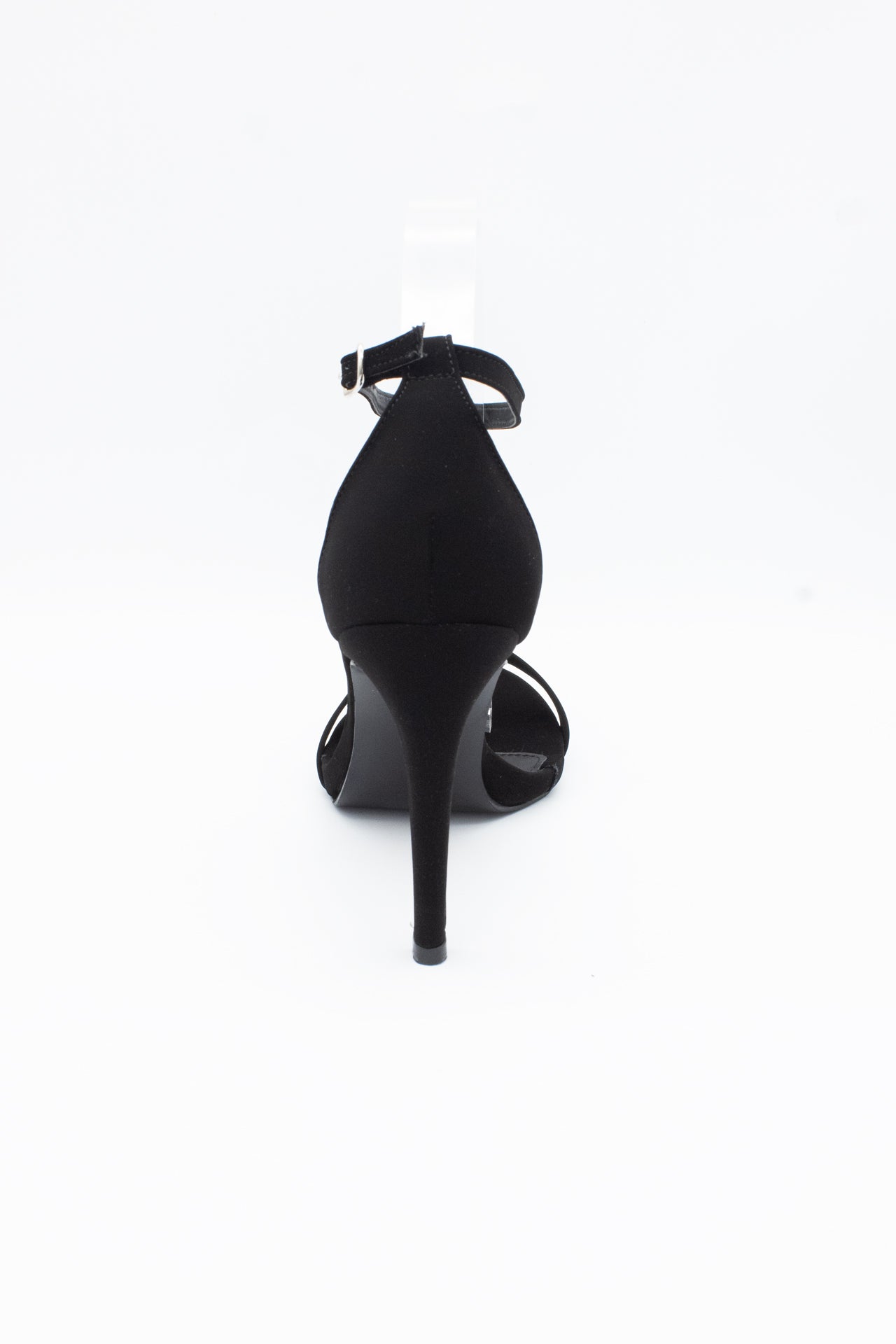Zapatilla de tacón destapada. Superficie en sintético negro