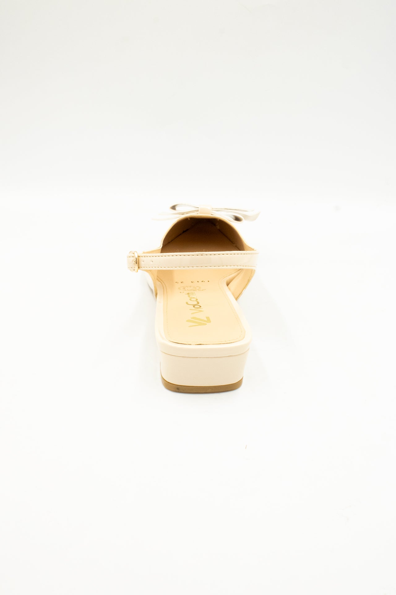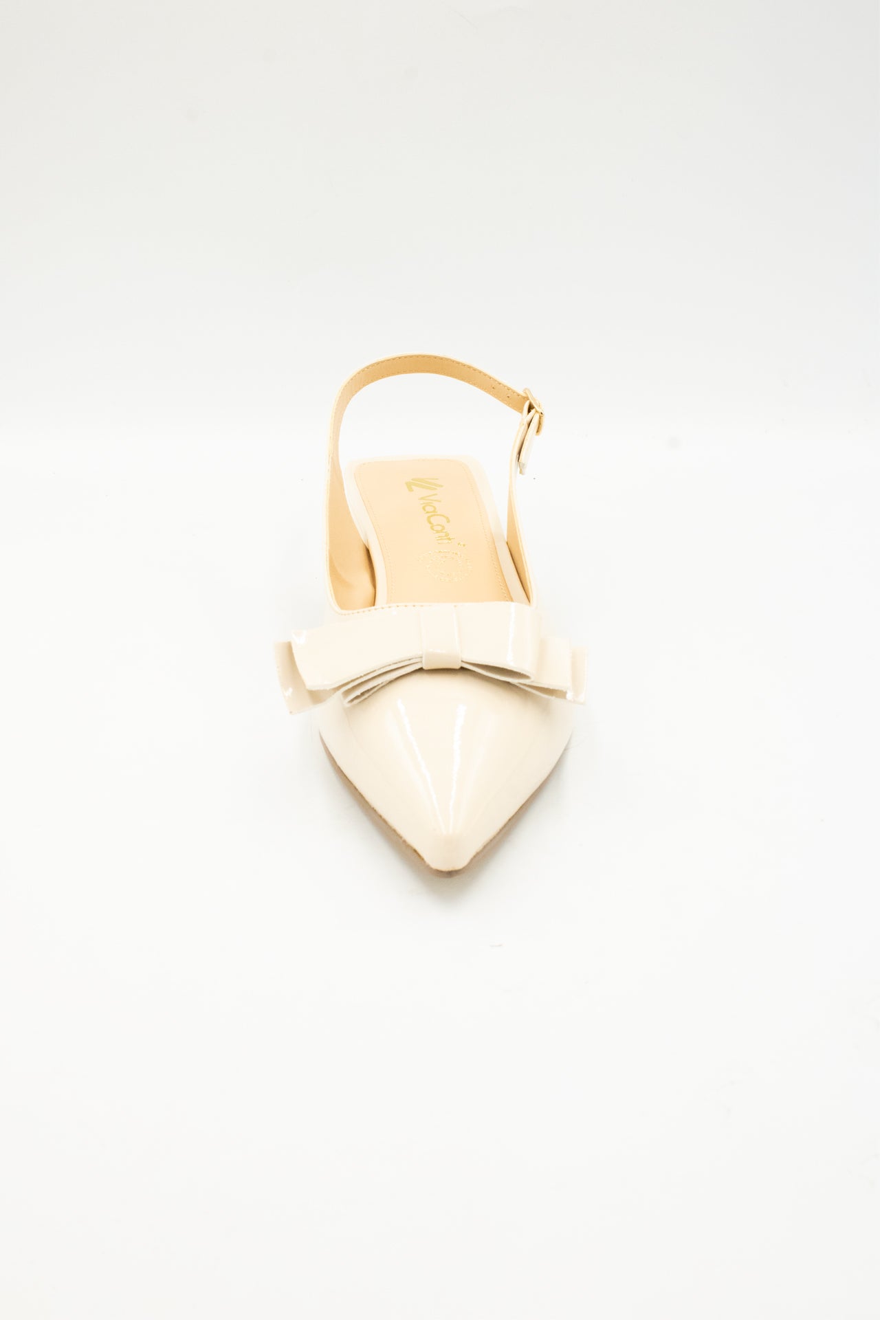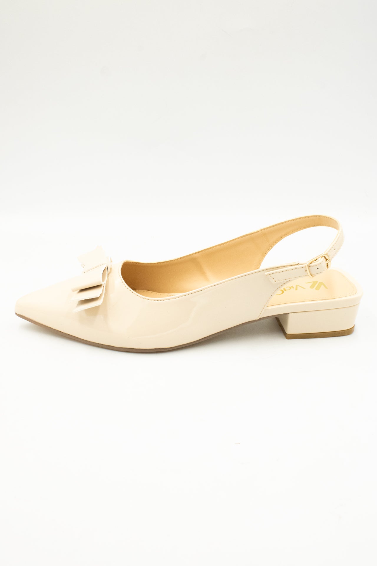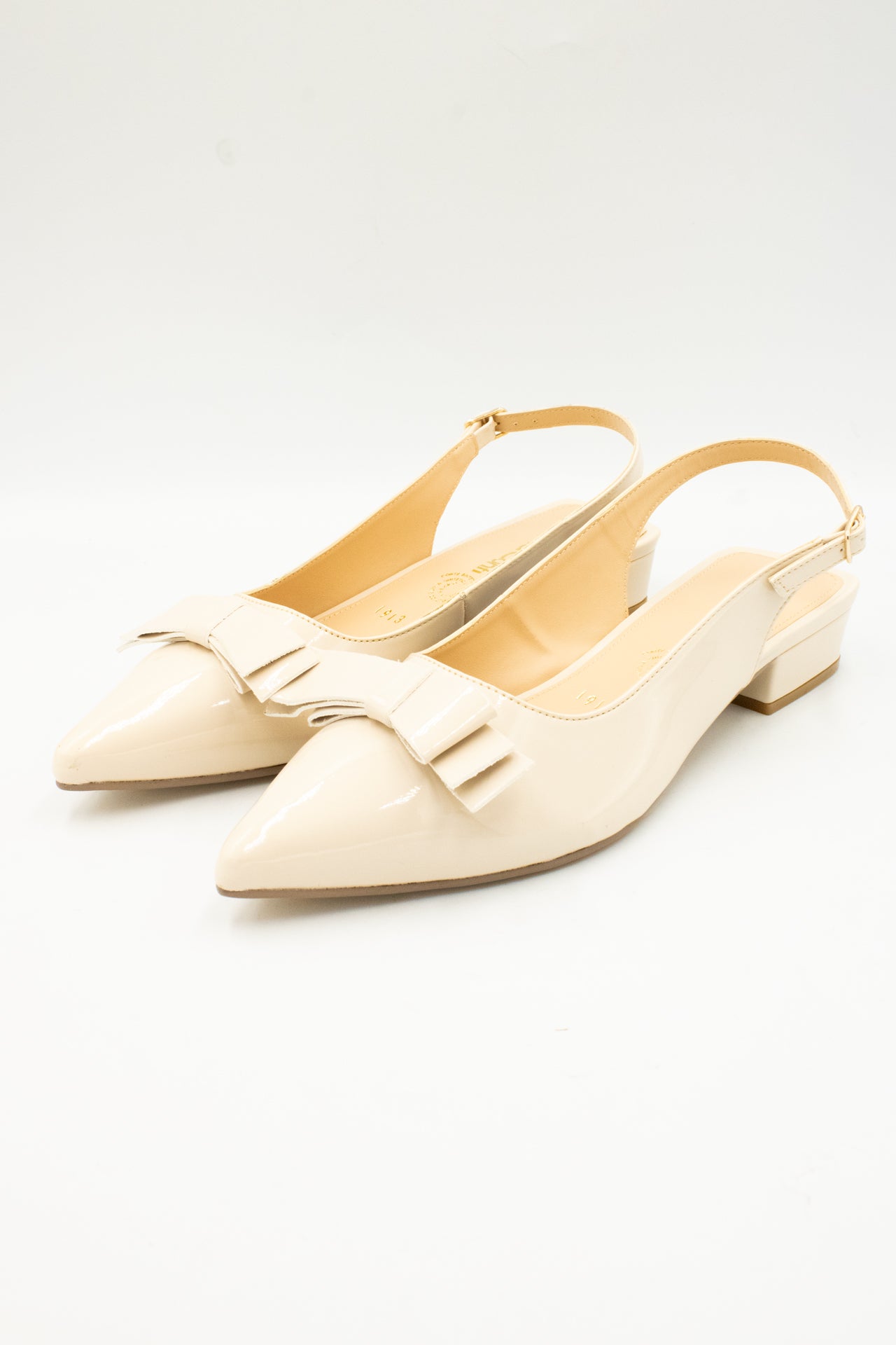 Zapatilla de piso, con moño y punta picuda. Superficie en Charol miga, sintético.