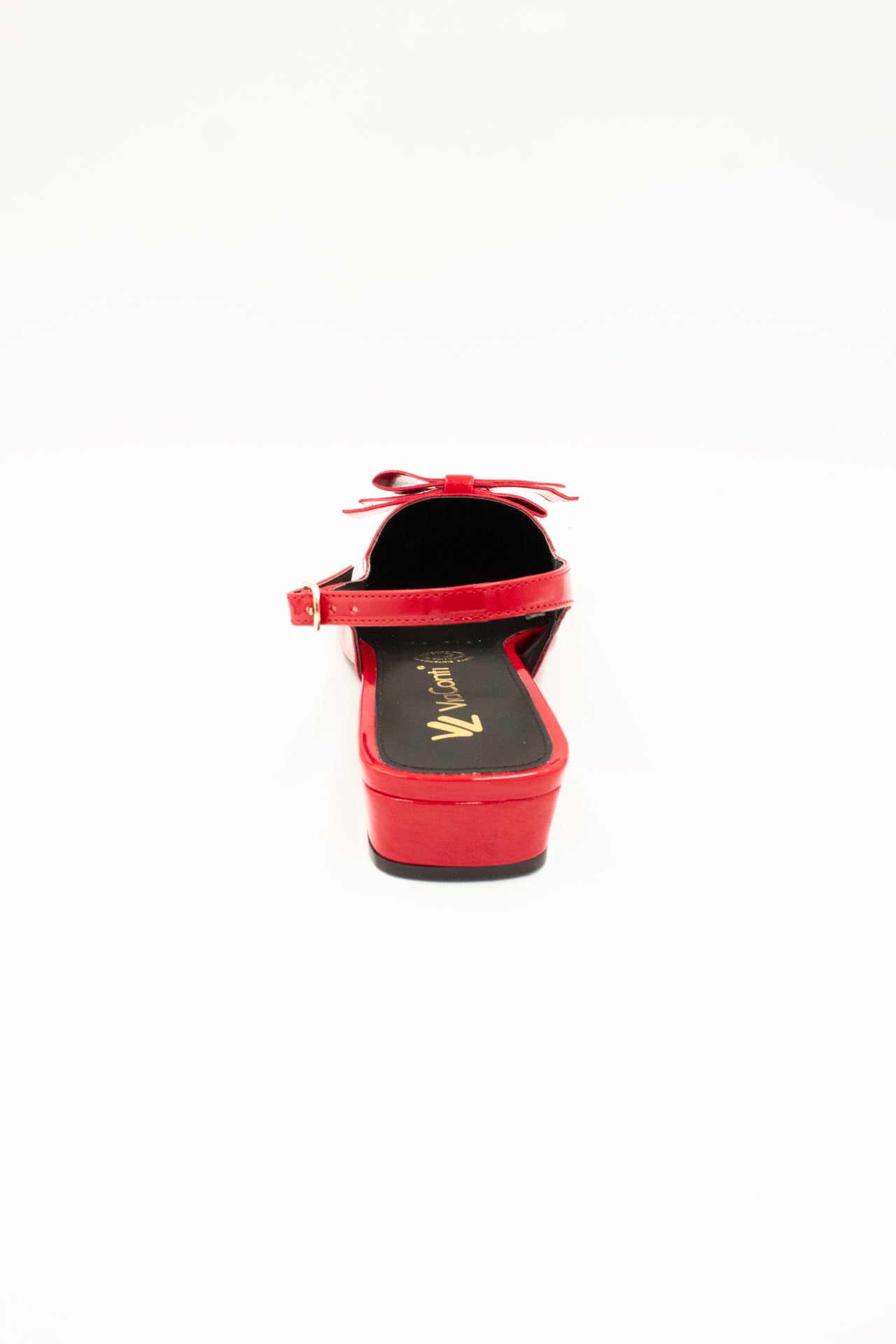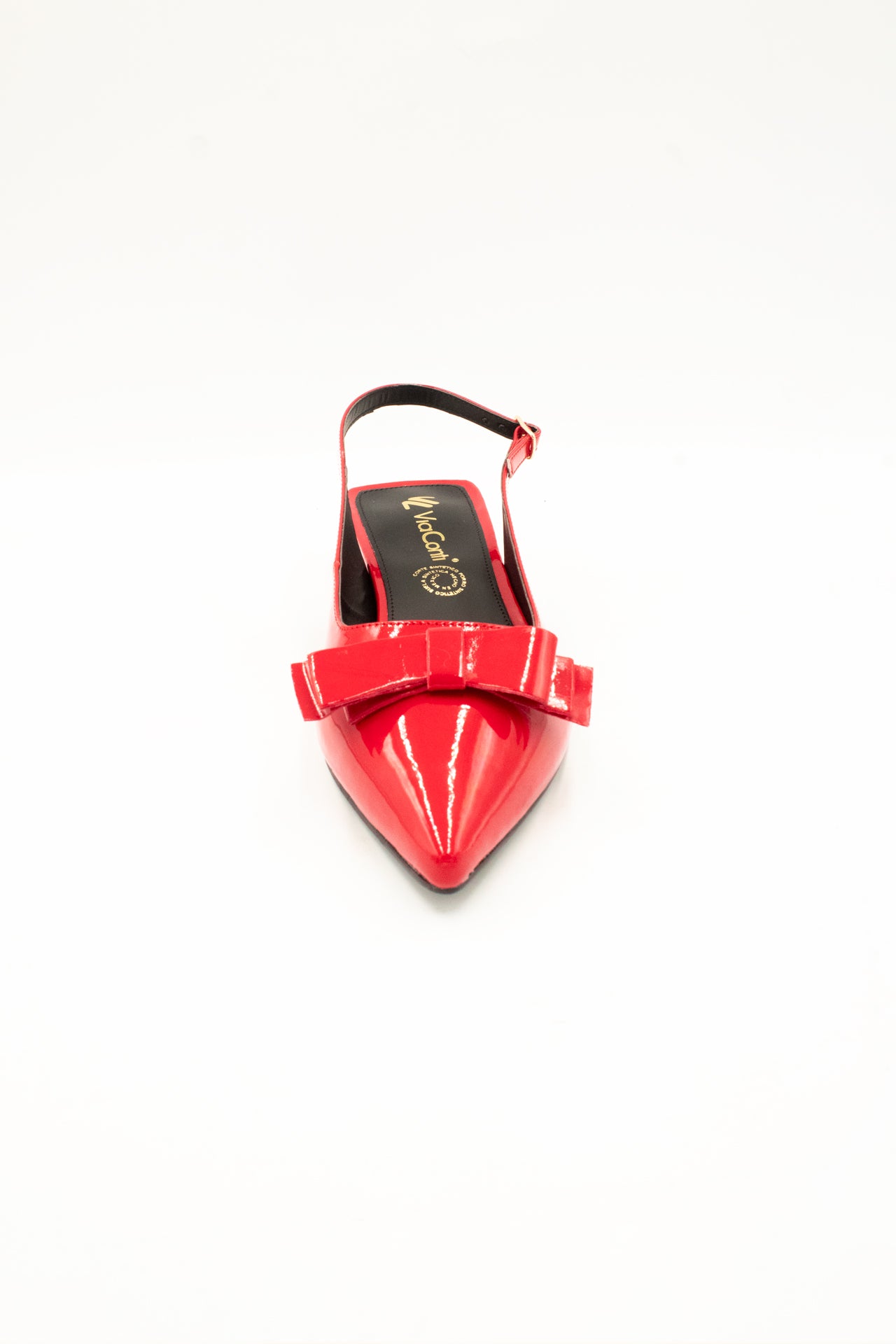 Zapatilla de piso, con moño y punta picuda. Superficie en Charol rojo, sintético.